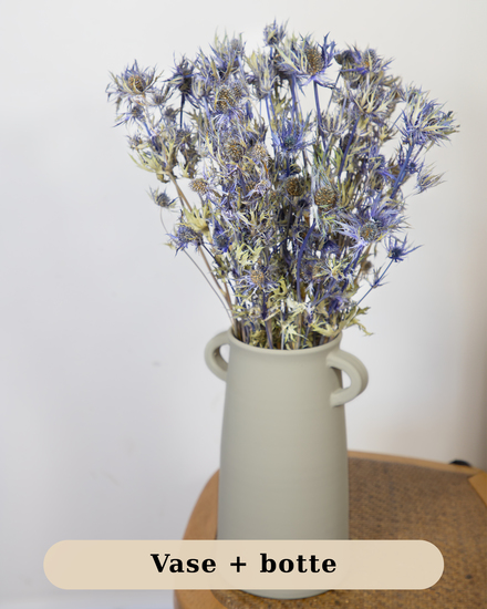 • Ajoutez une ambiance méridionale à votre intérieur avec cette élégante décoration, comprenant une botte d'eryngium accompagnée d'un vase vert gris au design raffiné. Idéale pour sublimer votre espace de vie ou pour offrir un présent unique.